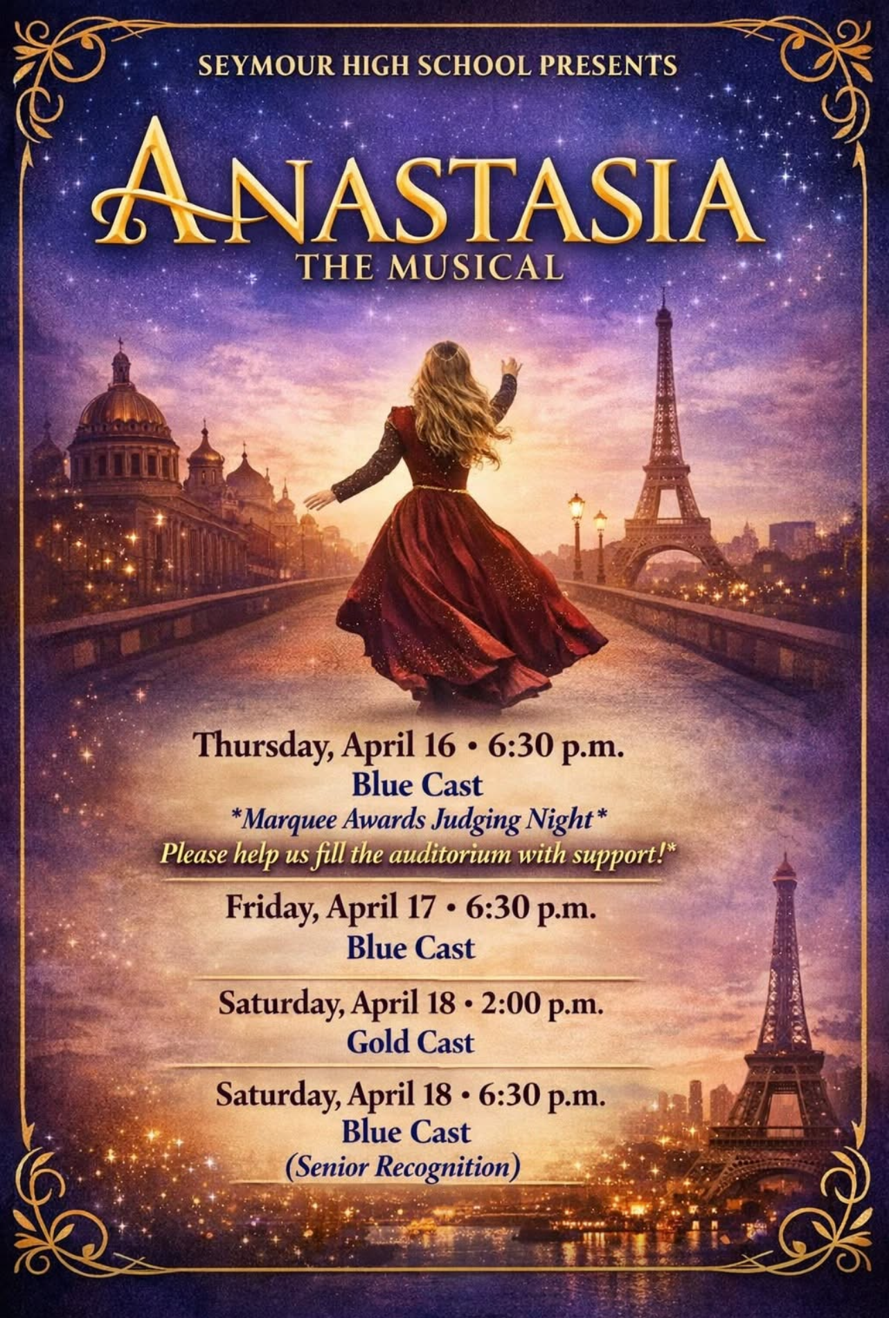 “Anastasia the Musical” at Seymour High School Thursday April 16th at 6:30 PMFriday April 17th at 6:30 PMSaturday April 18th at 2:00 PMSaturday April 18th at 6:30 PM